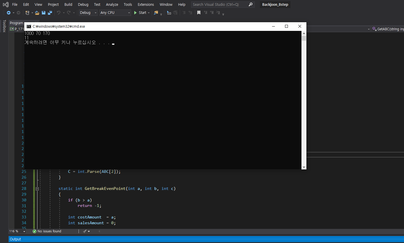 GetBreakEvenPoint() 함수를 구현했습니다. b>a, 즉 원가가 판매가보다 크면 영원히 손익분기점에 도달할 수 없기때문에 false를 의미하는 -1를 리턴해줍니다.